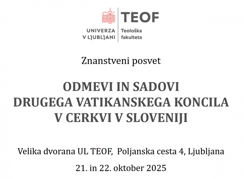 Inštitut za zgodovino Cerkve UL TEOF vabi k udeležbi na znanstvenem posvetu Odmevi in sadovi drugega vatikanskega koncila v cerkvi v Sloveniji, ki se bo odvil v torek in sredo, 21. in 22. oktobra 2025, v Veliki dvorani Teološke fakultete na Poljanski cesti 4 v Ljubljani.