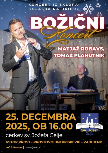 Dom sv. Jožef Celje vabi na koncert iz sklopa Glasba na hribu, vokalno-instrumentalni božični koncert z nastopom Matjaža Robavsa, baritona, in Tomaža Plahutnika, citer. Koncert bo v četrtek, 25. decembra 2025, ob 16. uri v cerkvi sv. Jožefa v Celju. Vstop je prost, vabljeni k prostovoljnim prispevkom.