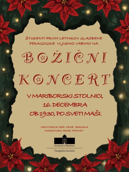 Študenti prvih letnikov glasbene pedagogike vabijo na božični koncert, ki bo v torek, 16. decembra 2025, ob 19.30 v mariborski stolnici, po večerni sveti maši. Koncert bo potekal pod mentorstvom red. prof. Adriane Magdovski in bo praznično glasbeno doživetje v adventnem času.