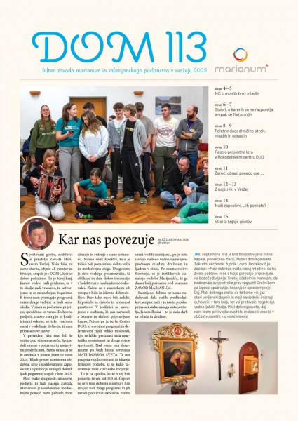 Da bi zaobjeli celoletno dogajanje, bi bil potreben nekaj sto stranski almanah. V Domu 113 so zato predstavljeni le drobci, izseki, posamezni dogodki, ki kažejo na celoto. Ker je salezijansko poslanstvo v prvi vrsti namenjeno mladim, je prav, da so v tokratnem Domu predstavljeni prav mladi, ki živijo in delujejo v Marijanišču ali ga obiskujejo. Nadalje smo dali besedo novemu vrhovnemu predstojniku salezijancev, Maltežanu Fabiu Attardu, ki se predstavi v obširnem pogovoru. Leto 2025 je bilo za Center DUO pestro v izpeljanih projektih, ki so dodobra razgibali področje rokodelstva in z njim povezanih okolij. V Domu 113 najdete še iskrive zapise največje skupine, ki v poletnem času pestri življenje Veržeja, nekaj vtisov iz knjige gostov ter veliko fotografij raznoraznih skupin, ki so se zvrstile v naši hiši.