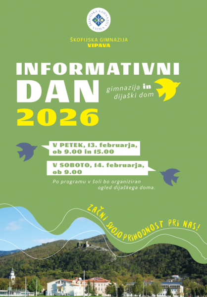 prisrčno vabljeni na informativni dan na Škofijski gimnaziji Vipava, ki bo potekal v petek, 13. 2. 2026, ob 9.00 in 15.00, ter v soboto, 14. 2. 2026, ob 9.00.