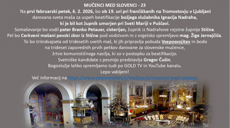 Na prvi februarski petek, 6. 2. 2026, bo ob 19. uri pri frančiškanih na Tromostovju v Ljubljani darovana sveta maša za uspeh beatifikacije božjega služabnika Ignacija Nadraha, ki je bil kot župnik umorjen pri Sveti Mariji v Puščavi.