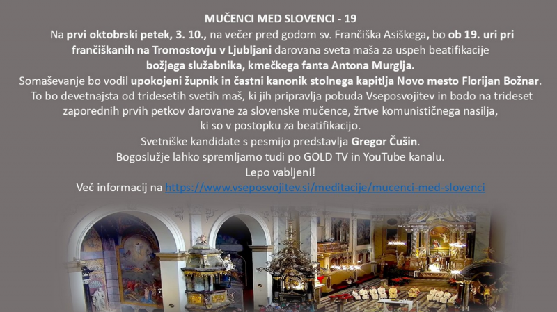 To bo devetnajsta od tridesetih svetih maš, ki jih pripravlja pobuda Vseposvojitev in bodo na trideset zaporednih prvih petkov darovane za slovenske mučence, žrtve komunističnega nasilja, ki so v postopku za beatifikacijo.