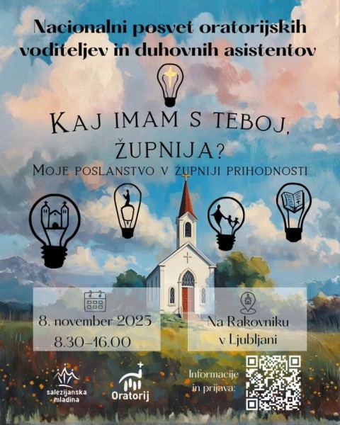 Združenje animatorjev Oratorija 8. novembra 2025 pripravlja posvet za voditelje in duhovne asistente oratorijev iz vse Slovenije. Posvet bo potekal v Ljubljani na Rakovniku. Posvet se bo začel ob 8.30, končal pa okrog 16.00.