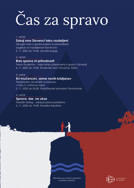 Prvi večer nam bo predstavil zgodovinske vzroke za razkol med Slovenci, pomen narodne sprave v javnem diskurzu in psihološki vidik.