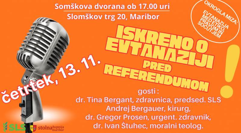 Stolna župnija Maribor in SLS Mariborski regijski odbor vabita na okroglo mizo Evtanazija – med etiko, pravom in sočutjem, ki bo v četrtek, 13. novembra 2025, ob 17. uri v Slomškovi dvorani, Slomškov trg 20, Maribor.