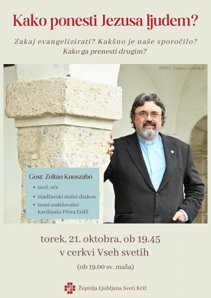 V torek, 21. oktobra, ob 19.45 bo v cerkvi Vseh svetih na Žalah zanimiv večer z naslovom »Kako ponesti Jezusa ljudem?« Madžarski diakon Zoltan Kunszabo, ki se že desetletja ukvarja z vprašanjem nove evangelizacije, bo iz svojih izkušenj spregovoril o tem, zakaj evangelizirati, kakšno je naše sporočilo in kako ga prenesti drugim. Lepo vabljeni na ta večer!