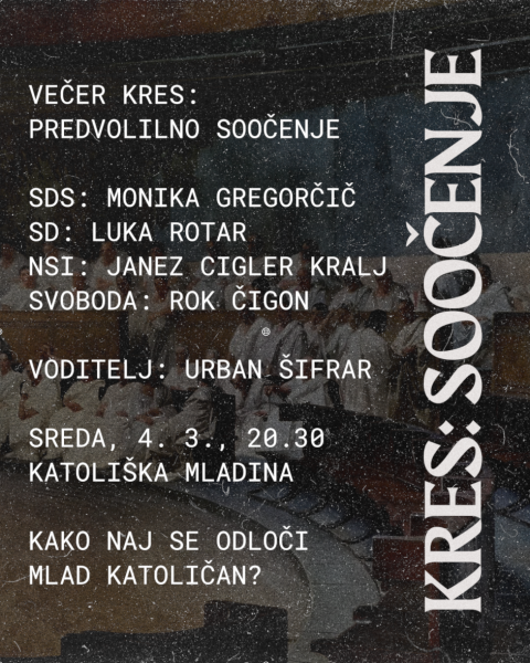 V sredo, 4. 3., ob 20.30, bomo na Katoliški mladini, v okviru večera Kres, pripravili predvolilno soočenje štirih parlamentarnih strank, SDS (Monika Gregorčič), SD (Luka Rotar), Svobode (Rok Čigon) in NSi (Janez Cigler Kralj). Naslovili bomo predvsem teme, ki najbolj zanimajo mlade katoličane; mladi lahko svoje želje in vprašanja zastavijo tudi v spletni anketi.