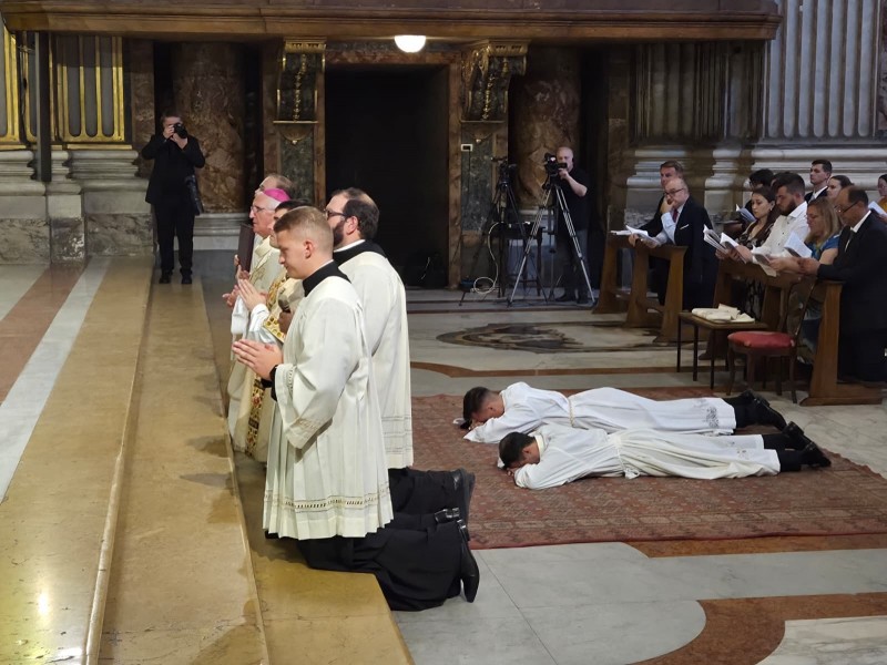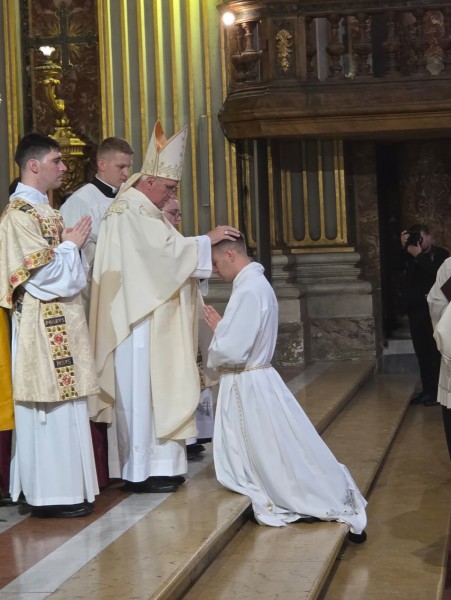 V tem slovesnem trenutku nas je med svoje z molitvijo, češčenjem in prošnjami prepojene zidove sprejela cerkev sv. Ignacija, da bodo njeno svetost in posvečenost povečale in okrepile tudi naše molitve in prošnje za naša kandidata Matija in Gregorja, ki bosta med to slovesno sveto mašo prejela diakonsko posvečenje. Zato z veseljem pozdravljam njegovo ekselenco Franca Buta, veleposlanika republike Slovenije pri Svetem Sedežu; njegovo ekselenco Matjaža Longara, veleposlanika republike Slovenije pri Italiji, generalnega vikarja reške škofije msgr. Maria Tomljanovića, rektorja kolegija Teutonik prelata Petra Klasvogta, rektorja ljubljanskega semenišča mag. Martina Zlobka in p. Roberta Althanna, ki je tu med nami v imenu generala Družbe Jezusove. Poseben pozdrav pa seveda velja tudi njunim domačim, staršem, bratom in sestram ter ostalim sorodnikom, ki so prišli, da bi Matija in Gregor doživela oporo in podporo tistih, ob katerih se je prebujal, rastel in odločal njun poklic za duhovništvo. Pozdravljeni tudi njuni prijatelji, zlasti prijatelji duhovniki in bogoslovci, ki ob njunem zgledu poživljajo svoje hrepenenje po popolni podaritvi Gospodu. Z nami so tudi predstavniki njunih župnij, v katerih sta začela delati prve korake služenja Cerkvi v pomoči svojim duhovnikom.