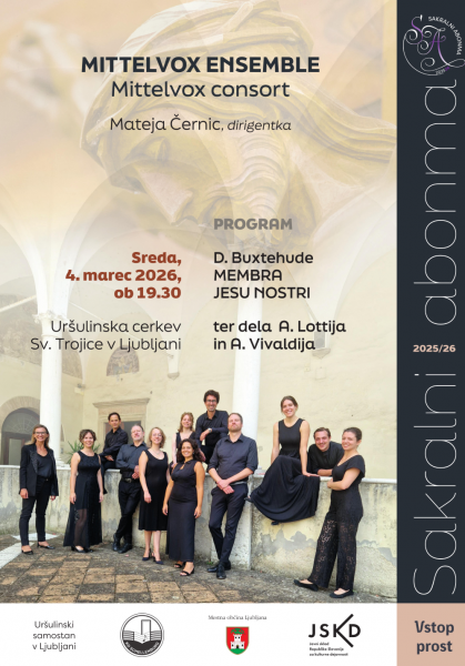 Vljudno vas vabimo na koncert Sakralnega abonmaja, na katerem bomo prisluhnili presunljivi glasbeni meditaciji baročnega skladatelja Dietricha Buxtehudeja, ki je v delu Membra Jesu nostri upodobil križanega Kristusa, ter glasbi skladateljev Antonia Lottija in Antonia Vivaldija.