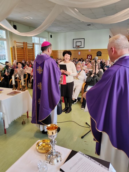 Ob koncu maše je škof Saje podelil škofijsko priznanje in zahvalo gospe Jožici Piltaver, ki je 40 let skrbela za molitveno življenje v Domu, za to, da so oskrbovanci lahko prejemali zakramente in da se je redno darovala sveta maša.