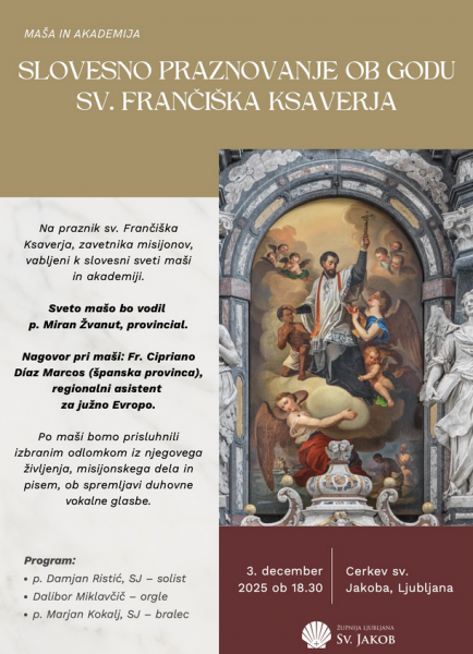 Na praznik sv. Frančiška Ksaverja, zavetnika misijonov in velikega jezuita, vas vabimo k sv. maši in akademiji pri sv. Jakobu. Sveto mašo bo vodil p. Miran Žvanut, provincial, nagovor pri maši pa bo imel Fr. Cipriano Díaz Marcos (španska provinca), regionalni asistent za južno Evropo.