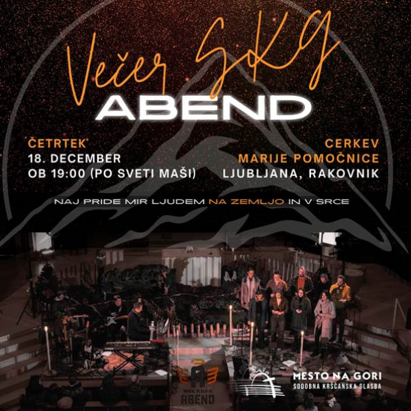 V četrtek, 18. decembra 2025, ob 19. uri, po sveti maši, ste vabljeni na večer slavljenja, ki bo potekal v cerkvi Marije Pomočnice v Ljubljani na Rakovniku. V molitvi, pesmi in zbranosti bomo skupaj prosili, naj pride mir ljudem na zemljo in v srce. Večer bo priložnost za duhovno poglobitev in skupno slavljenje v adventnem času. Vabljeni.